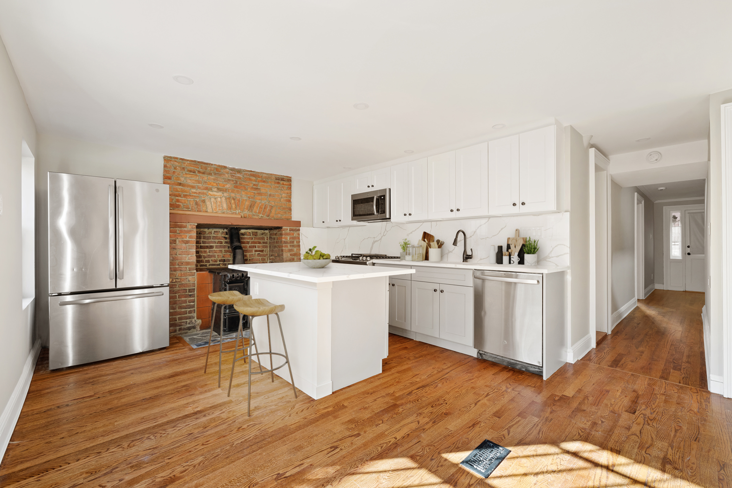 Old-world details-including ornate moldings, ceiling medallions, wainscoting and four decorative marble fireplaces-harmonize with modern finishes like recessed lighting, beautiful hardwood floors, and sleek kitchen and bathroom fittings.